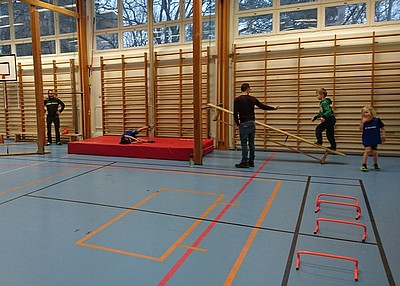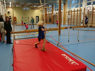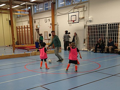 Tänkte att det var på tiden att berätta lite om vad vi gör i Knattegruppen på lördagar i Solbergaskolan. Knattegruppen består av barn födda 2013/2014 som började under hösten 2019, samt några nytillkomna sedan nyåret. Även om de flesta i gruppen är födda 2013/2014 har vi även några barn födda 2015 som deltar. En typisk inomhusträning med den här gruppen inleds med några minuter fri lek med boll. Därefter är det samling och upprop. Syftet med uppropet är att alla barn ska känna sig uppmärksammade. Vid samlingen berättar vi vad vi ska göra under träningen. Vi delar även in barnen i fyra grupper om 3 - 5 barn beroende på hur många som deltar. Varje grupp får en egen färg på västen. Efter att alla har fått sin väst får några av de deltagande föräldrarna i uppgift att köra en uppvärmnings lek medans övriga hjälps åt att göra i ordning en hinderbana. Uppvärmningen kan t.ex. vara svanskull, tjuv- och polis, eller någon annan lek med rörelse som vi kombinerar med boll. En hinderbana kan t.ex. bestå av hopp i höjdhoppsmatta + kullerbytta, armgång, balansgång, svinga sig i lianer, och jämfotahopp över låga häckar. Syftet med hinderbanan är att ge barnen möjlighet till träning av allmänna motoriska färdigheter som koordination och balans. Medans en av grupperna kör hinderbana spelar två av grupperna match mot varandra, och den fjärde gruppen gör en spelövning som går ut på att de ska hindra ledaren att ta bollen genom att passa till varandra, byta positioner och hitta fria ytor.