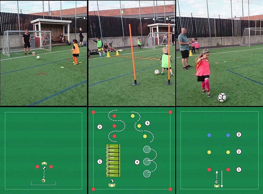 Vi inledde träningen med tre olika stationer (se bild ovan). I station Nr1 skulle man träna på straffsparkar. Station Nr2 var en hinderbana och station Nr3 var en stafett. För de olika stationerna gällde följande: