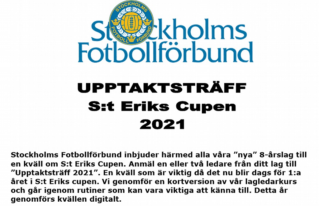 Stockholms Fotbollförbund inbjuder alla ”nya” 8-årslag till en kväll om S:t Eriks Cupen. Anmäl en eller två ledare från ditt lag till ”Upptaktsträff 2021”. En kväll som är viktig då det nu blir dags för 1:a året i S:t Eriks cupen. Vi genomför en kortversion av vår lagledarkurs och går igenom rutiner som kan vara viktiga att känna till. Detta år genomförs kvällen digitalt.