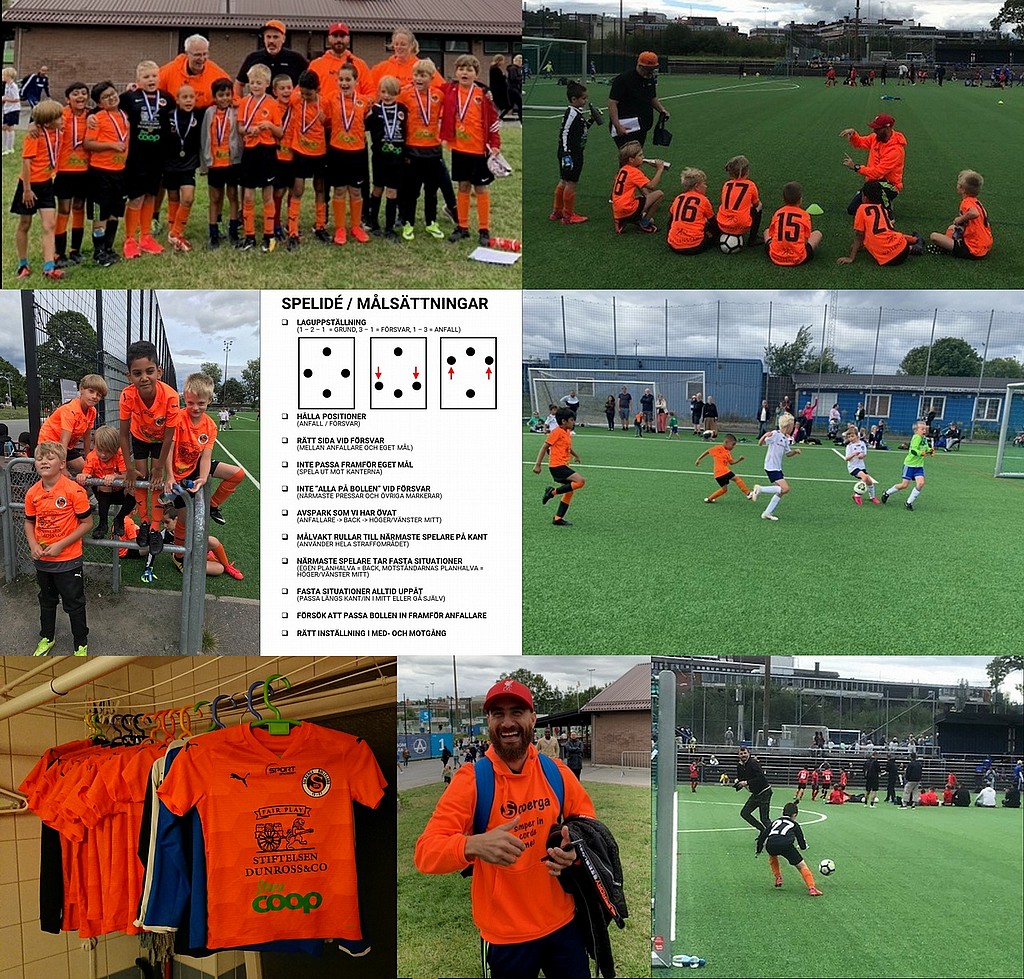 I utmärkt men något blåsigt väder deltog Solberga BK P13 i Santis Summer Cup på Älvsjö IP med två lag som spelade tre matcher var om 3 x 12 minuter. Lag Orange som coachades av Magnus och Frida (Davids mamma) utgjordes av Lowe, Tim, Calvin, Jacob, Madhav, Aarav och Arnav. Lag Svart som coachades av Mattias (Daniels pappa) och Andi (Lex pappa) utgjordes av Daniel, Yohannes, David, Elis, Benjamin, Anton och Lex. Matcherna var jämna och alla spelare gjorde bra insatser på plan. I lag Orange stod Lowe mellan stolparna och gjorde många fina räddningar i samtliga matcher. I lag Svart turades Daniel, Yohannes och David om att stå varsin match. Även här stod samtliga tre målvakter för många fina insatser. Innan båda lagens första matcher hade vi en gemensam genomgång över våra mål med turneringens matcher. Det viktigaste av dessa var att oavsett hur matchen går och hur många mål det blir, alltid kämpa på och ha en positiv attityd. Denna målsättning klarade killarna av galant. Våra övriga målsättningar var: Laguppställning (1 - 2 - 1), Hålla våra positioner (anfall och försvar), Rätt sida vid försvar (mellan anfallare och eget mål), Inte passa in bollen framför eget mål (spela ut mot kanterna), Inte "alla på bollen" vid försvar (närmaste pressar och övriga markerar), Avspark som vi har övat (anfallare -> back -> höger/vänster mitt), Alla fasta situationer spelas alltid uppåt (passa längs kant, in mot motståndarnas mål eller gå själv) och Passa bollen in framför anfallare (höger/vänster mitt). I stort, och särskit med tanke på att laget inte har övat så mycket på allt detta, lyckades man överlag bra med att spela som vi sa att vi skulle spela. Visst blev det en och annan pass framför eget mål i bland, och visst höll vi inte alltid våra positioner när vi blev ivriga i anfallen... MEN, spelarna förväntas inte kunna allt detta föränn om ett och halvt år från nu. Sammanfattningsvis var det en mycket bra insats av båda lagen där det bjöds på många fina passningar, bra fotboll och fina insatser idag.