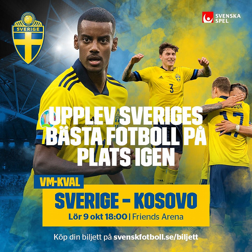 9 oktober kl. 18.00 spelar Sverige VM-kvalmatch mot Kosovo kl. på 18.00 Friends Arena.