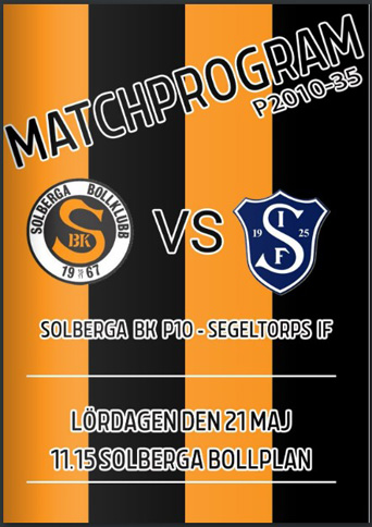 Lördagen den 21 MAJ Klockan 11.15 möter Solberga BK:s P10, Segeltorps IF på hemmaborg Solberga BP. Ladda upp med vårt digitala matchprogram!